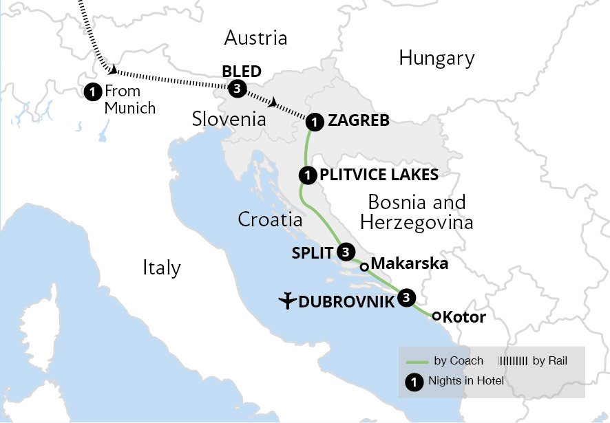 Enjoy a discovery of the Adriatic countries of Slovenia, Croatia and Montenegro, uncovering natural wonders and idyllic towns in this ancient corner of Europe. Unwind beside pristine Lake Bled, stroll among the pretty streets of Slovenia's compact capital, Ljubljana, explore Croatia's breathtaking Plitvice Lakes and enchanting walled city of Dubrovnik before exploring Montenegro's stunning Bay of Kotor. In Germany, delve into Bavaria's fairytale forests and castles, enjoying celebrated food and drink. Add in spectacular Christmas markets in towns along the romantic Rhine and it's easy to see why Germany is an attractive destination all year round. Explore all of this and more with Great Rail Journeys.