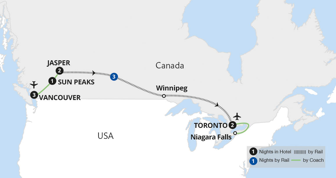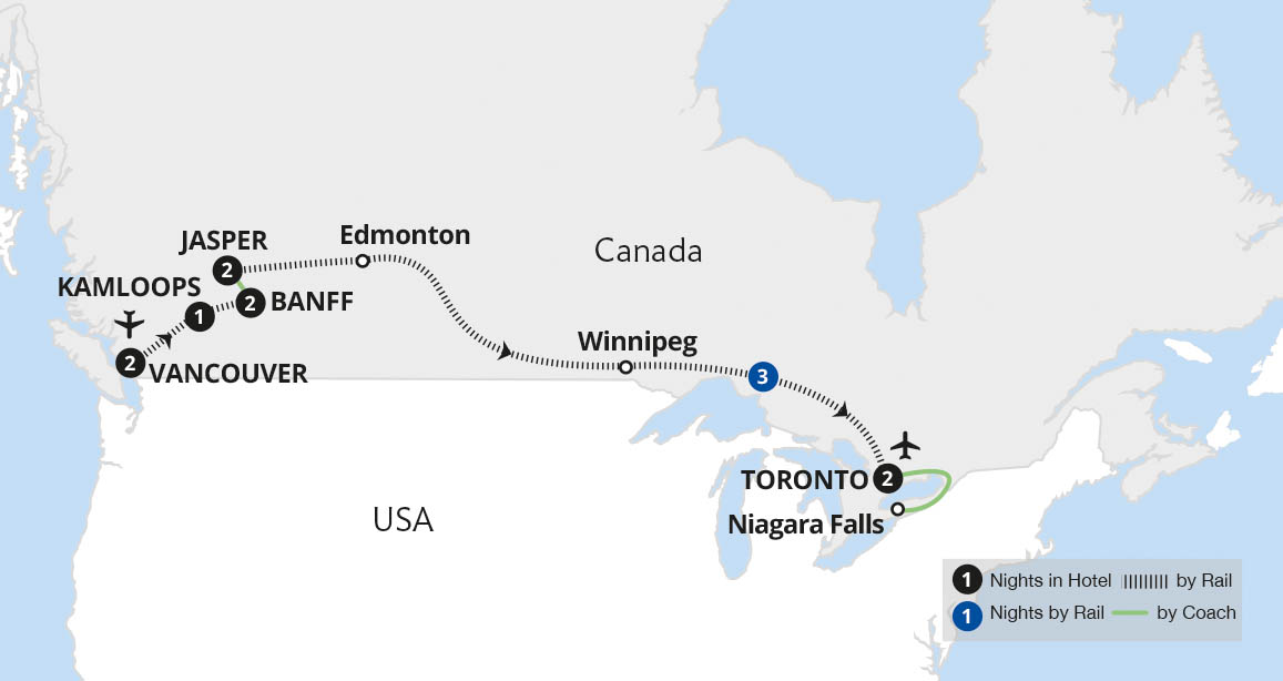 Experience three different train journeys through Canada, as you ride the rails along routes flanked by breathtaking scenery. Beginning in Vancouver, you'll Take VIA Rail's Canadian train to Toronto, where you'll visit Niagara Falls, before boarding VIA Rail's Corridor Service to Montreal and Quebec, where you'll board VIA Rail's Ocean train...
