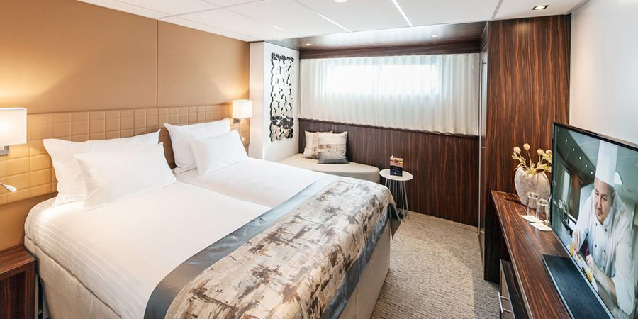 Accommodation on board our ships is some of the finest found on any river cruise ships operated across Europe. We strive to offer you the best with our staterooms and suites, prioritising comfort, space and taste above all else, and giving all the quality of a 5-Star hotel room on water. From enormous windows providing sumptuous views of the passing landscapes, to well-appointed furniture as well as tea & coffee making facilities, every cabin aboard our ships is designed to impress and indulge.